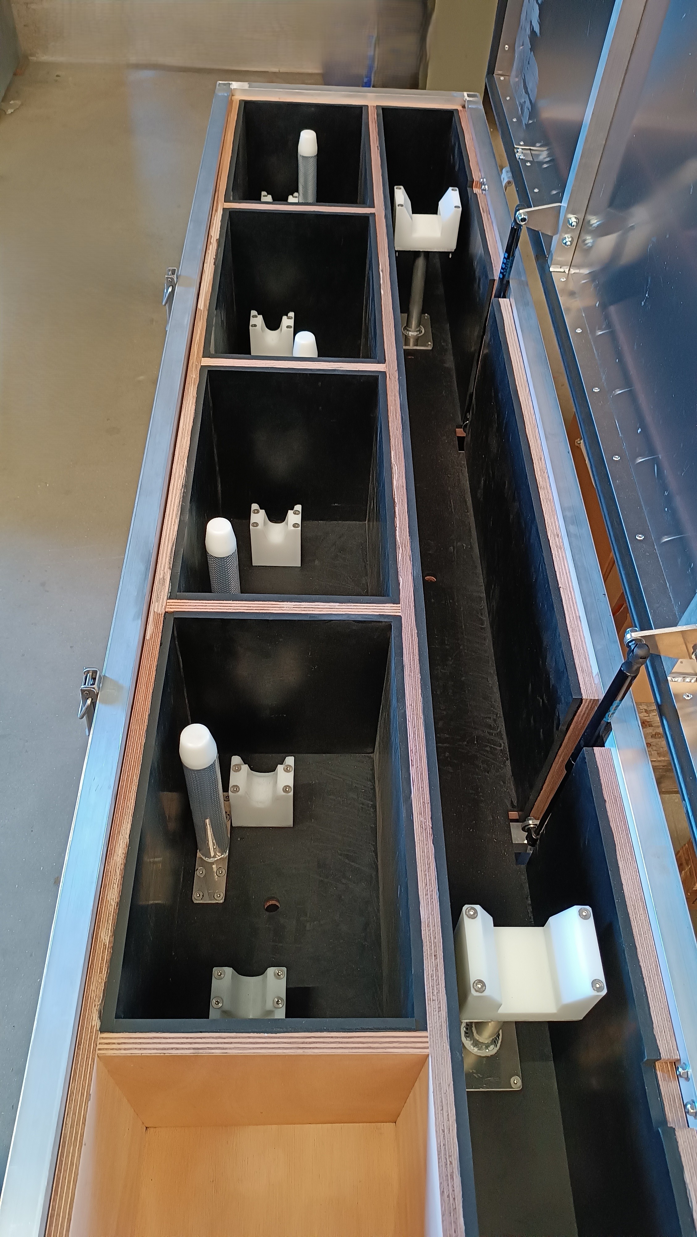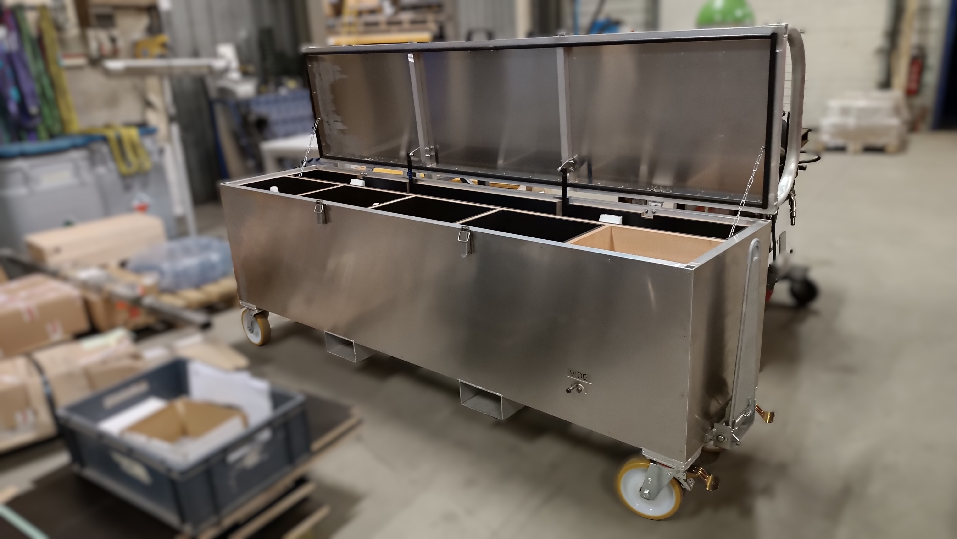 Réalisation avec intégration de nouveaux éléments d'un chariot de transport d'équipement. Basé sur un châssis mécano-soudé en aluminium léger et robuste monté sur 4 roulettes pivotantes avec freins, cet outillage logistique dédié à la production est équipé d'un caisson bois revêtu de plaques en nitriles pour éviter toute détérioration des pièces. Un système d'interface permette le maintien et le détrompage des différents éléments dans leurs alvéoles respectives tout en les protégeant des chocs ou rayures. Ain de garder à l'abri des intempéries et de la poussière ces équipements, cette caisse roulante dispose d'un capot pivotant sur charnières. Ce dernier est muni de vérins à gaz pour limiter les efforts à l'ouverture, de chainettes en inox pour assurer une fin de course en position ouverte, d'un joint sur toute la périphérie et de grenouillère pour maintenir l'ensemble bien fermé et garantir le placage du joint et l'étanchéité de l'ensemble. Ce coffre dispose également de poignées en tube cintré pour assurer la manutention manuelle et le chariot est muni d'un timon et d'un crochet pour les opérations de manutention mécanique ainsi que de passe-fourches en partie inférieure.